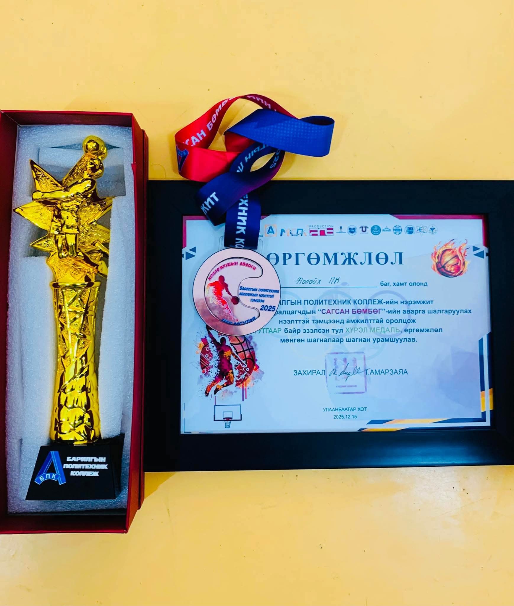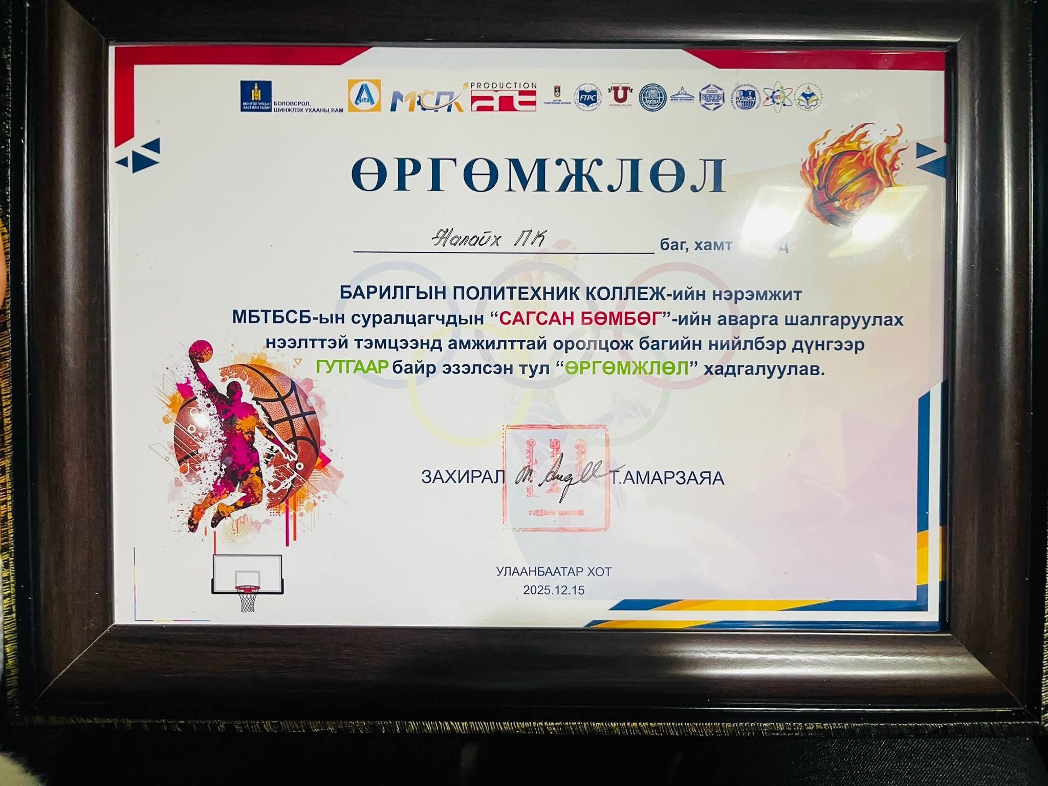 Барилгын политехник коллежийн нэрэмжит МБТБСБ-ын суралцагчдын аварга шалгаруулах сагсан бөмбөгийн тэмцээнд манай сургуулийн эмэгтэй баг анх удаа оролцож, хүрэл медаль хүртэж багийн нийт дүнгээр гутгаар байр эзэллээ.
