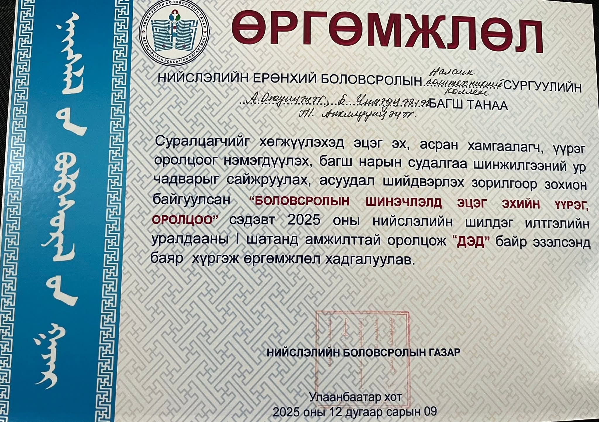 2025-2026 оны хичээлийн жилд зохион байгуулагдсан “Боловсролын шинэчлэлд эцэг эхийн үүрэг, оролцоо” сэдэвт Нийслэлийн шилдэг илтгэлийн уралдаанд багш А.Оюунцэцэг, Б.Чимэдцээлээ, Т.Анхилуунцэцэг нар амжилттай оролцож, дэд байр эзэллээ.